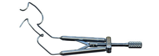 Adjustable Eye Speculum designed for the temporal approach and used to expose the ocular surface by preventing eyelids from closing.