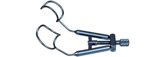 Adjustable Eye Speculum designed for the temporal approach and used to expose the ocular surface by preventing eyelids from closing.